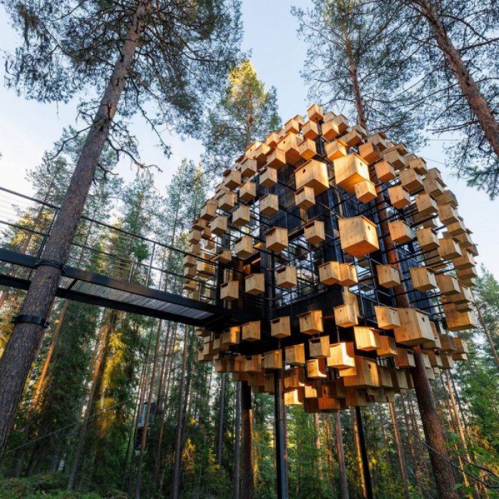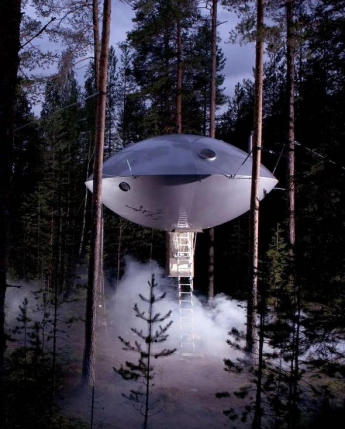 Номера шведского отеля Treehotel расположены глубоко в лесу. Каждый из номеров представляет из себя отдельное строение с авторским дизайном. Каждый номер является чем-то особым. Хотите провести выходные в летающей тарелке? А большом скворечнике?