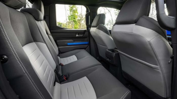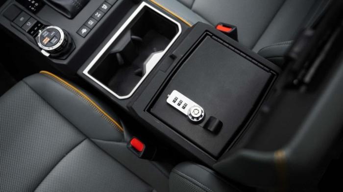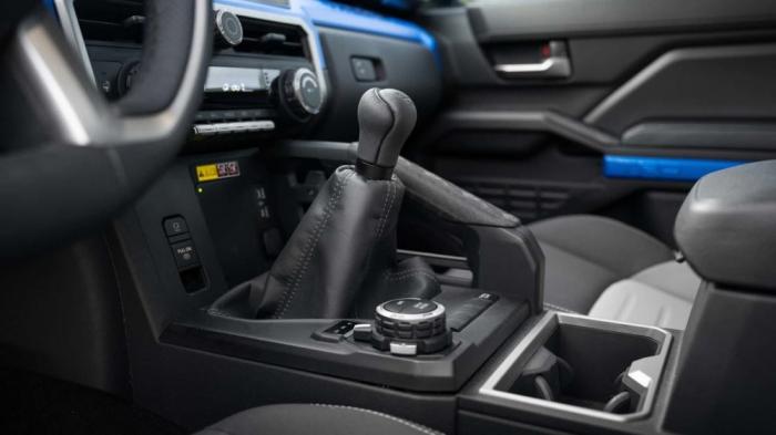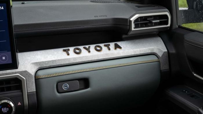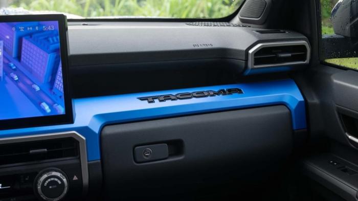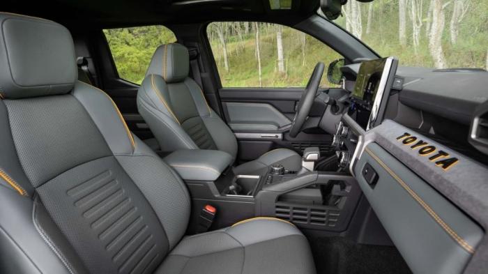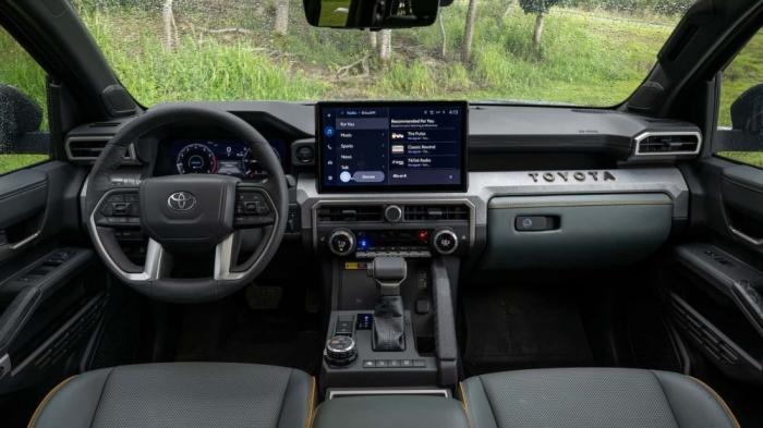 Как внешне, так и изнутри Toyota Tacoma копирует старшую модель Tundra с поправкой на разницу в классе. Прямоугольный интерьер с массивными дефлекторами вентиляции и новым рулём сопровождается двумя экранами уже в базовой комплектации с диагональю 7 дюймов для панели приборов и 8 дюймов для медиасистемы. В более дорогих версиях они вырастут до 12,3 и 14 дюймов соответственно. Изюминкой топовой версии станет съёмный динамик JBL — на кемпинге его можно использовать как bluetooth-колонку.