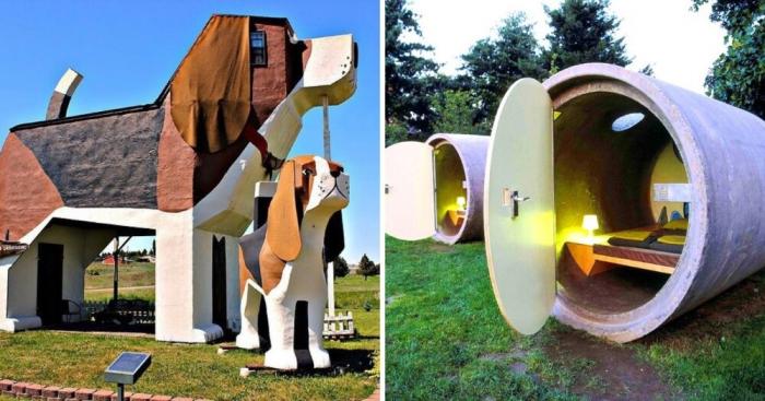 Важным пунктом в планировании путешествия является выбор места для ночёвки. Какой отель предпочтёте? Может вы хотите переночевать в брюхе огромной собаки? Или в большом скворечнике? А хотите посмотреть на северное сияние через стеклянный купол? А может хотите провести ночь в большой бетонной трубе? Создатели отелей, желающие заработать на туристах, которые тянутся ко всему необычному, развернулись со своей фантазией так, что не сразу понятно, шутят они или нет.