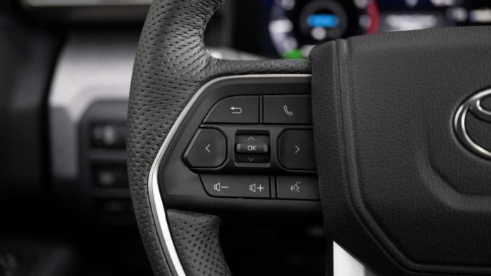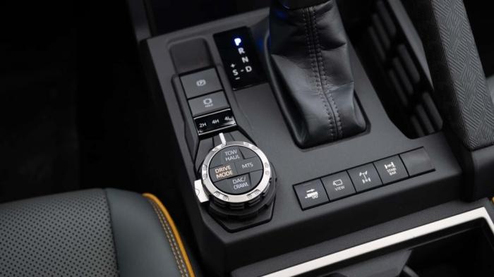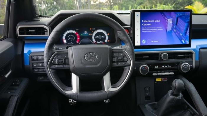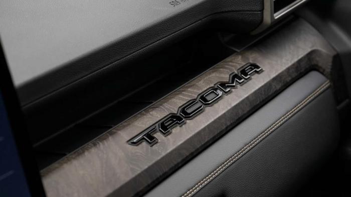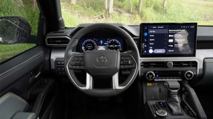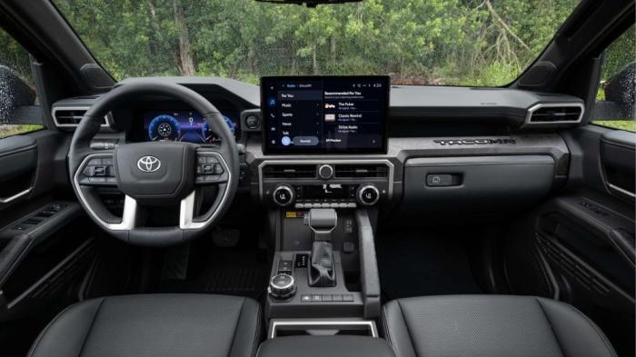 Как внешне, так и изнутри Toyota Tacoma копирует старшую модель Tundra с поправкой на разницу в классе. Прямоугольный интерьер с массивными дефлекторами вентиляции и новым рулём сопровождается двумя экранами уже в базовой комплектации с диагональю 7 дюймов для панели приборов и 8 дюймов для медиасистемы. В более дорогих версиях они вырастут до 12,3 и 14 дюймов соответственно. Изюминкой топовой версии станет съёмный динамик JBL — на кемпинге его можно использовать как bluetooth-колонку.