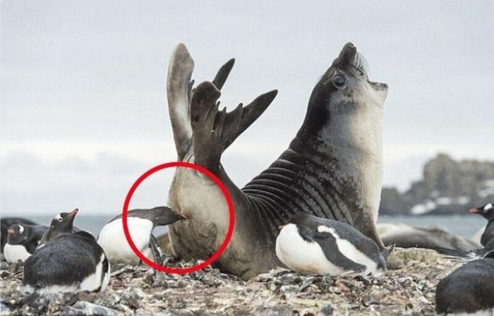 Пингвин ущипнул тюленя, чтобы прогнать его со своей территории